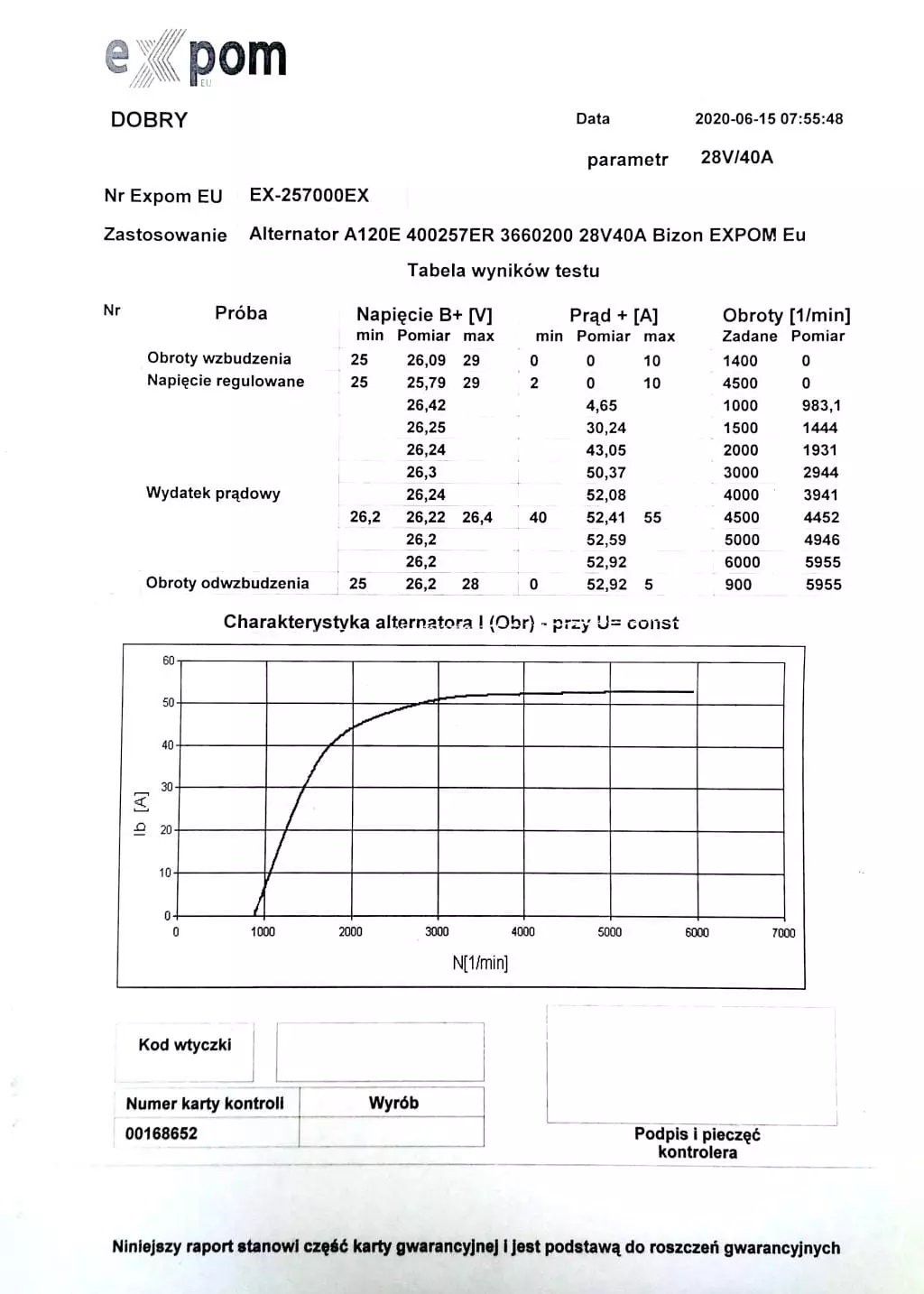 Alternator do kombajnu Bizon EXPOM KWIDZYN eu wykonany z najwyższej jakości komponentów dostarczanych tylko przez sprawdzonych i audytowanych poddostawców. 100% alternatorów przechodzi test wstępny oraz test końcowy zwieńczony wydrukiem z numerem seryjnym. Numer ten wraz z testem pozostaje zachowany w archiwum Expom Kwidzyn Eu oraz jego indywidualna kopia dołączona jest do produktu. Alternatory EXPOM KWIDZYN eu posiadają wydłużoną do 36 miesięcy gwarancję.