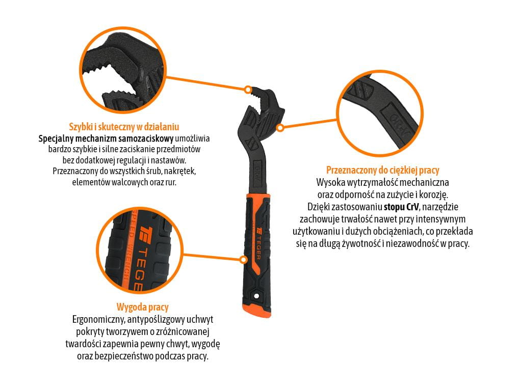 Zastosowanie: Narzędzia TEGER nadają się dla każdego majsterkowicza jak i profesjonalisty. Znajdą zastosowanie w przydomowym garażu gospodarstwie rolnym oraz na budowie. Klucz nastawny samozaciskowy to idealny wybór do zastosowań profesjonalnych zarówno w warsztatach mechanicznych jak i podczas prac domowych. Dzięki samozaciskowej konstrukcji klucz zapewnia błyskawiczną obsługę i pewny chwyt co czyni go niezastąpionym narzędziem w profesjonalnych i domowych zastosowaniach.