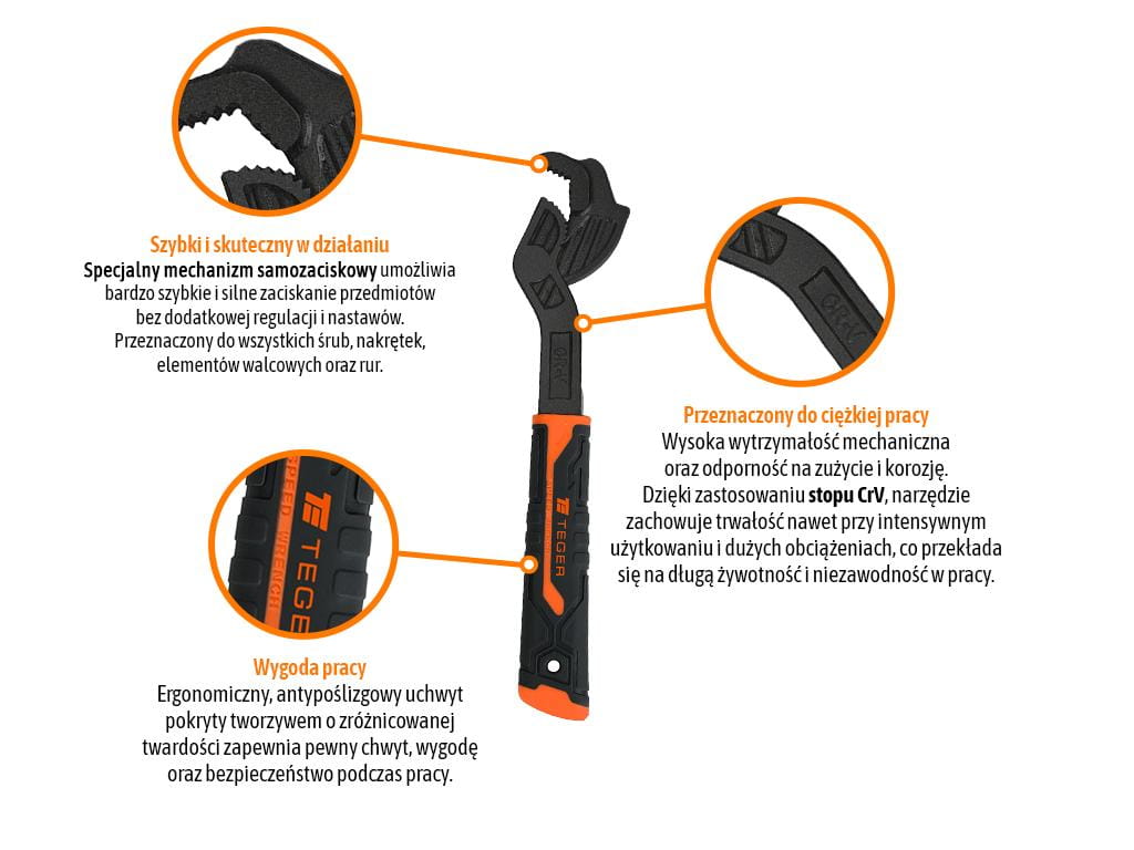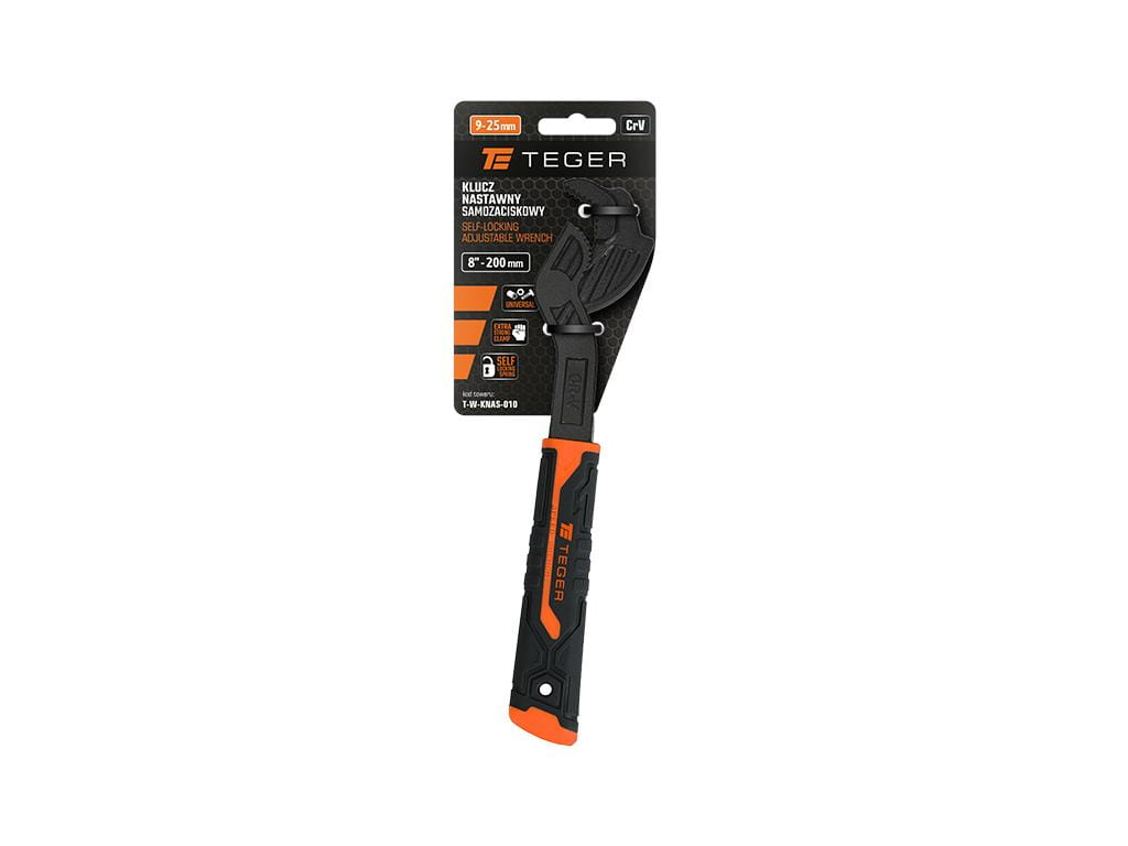 Klucz nastawny samozaciskowy 8" 200 mm TEGER to profesjonalny uniwersalny klucz nastawny, przeznaczony do wszystkich śrub, nakrętek, elementów walcowych oraz rur.