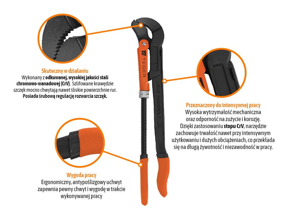 Klucz nastawny szwedzki Typ "S" 2" TEGER to profesjonalne narzędzie przeznaczone do pracy z rurami o średnicy do 58 mm. Wykonany z odkuwanej, wysokiej jakości stali chromowo-wanadowej (CrV) charakteryzuje się trwałością i odpornością na ścieranie. Klucz idealnie nadaje się do zastosowań w mechanice oraz przy montażu instalacji hydraulicznych. Szlifowane krawędzie szczęk mocno chwytają nawet śliskie powierzchnie rur. Rękojeść zakończona jest powłoką antypoślizgową, która sprawia, że klucz dobrze leży w dłoni i gwarantuje pewny chwyt. Posiada śrubową regulację rozwarcia szczęk pozwalającą na dopasowanie go do różnych rozmiarów rur, co czyni go wszechstronnym i niezastąpionym narzędziem w każdej profesjonalnej skrzynce narzędziowej.