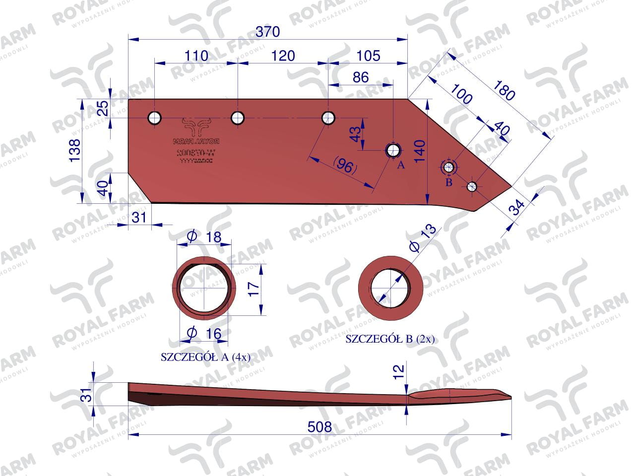 Lemiesz prawy 14" Kverneland 073002 stal borowa Royal Farm