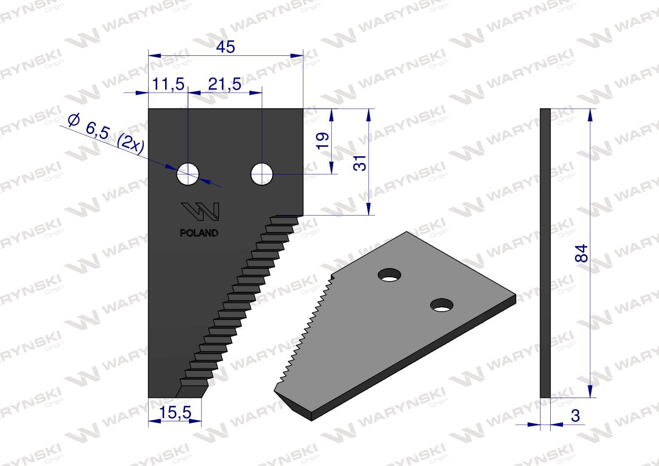 Nóż żniwny końcowy 84x45x3mm otwór 6.5 19 zębów Claas 6112041 6112031 WARYŃSKI