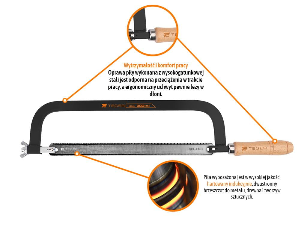 Oprawa piły wykonana z wysokogatunkowej stali jest odporna na przeciążenia w trakcie pracy, a ergonomiczny uchwyt pewnie leży w dłoni.