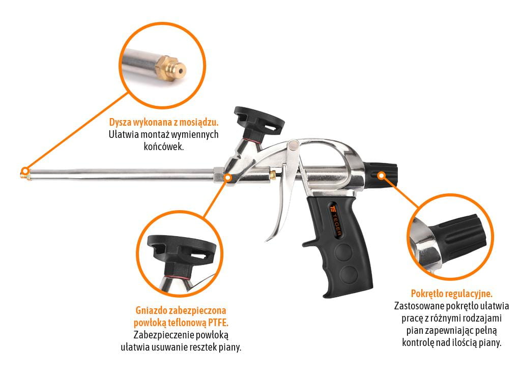 Wysokiej jakości pistolet do aplikacji pianek poliuretanowych. Wykonany ze stali nierdzewnej, aluminium i mosiądzu. Gniazdo przyłączeniowe zabezpieczone powłoką teflonową PTFE, zmniejszającą przyleganie pianki do elementu. Wyposażony w duże pokrętło do regulacji strumienia, zapewniający pełną kontrolę nad ilością aplikowanej piany. Ergonomicznie ukształtowany uchwyt w połączeniu z dobrym wyważeniem, umożliwia łatwą aplikację pianki za pomocą jednej ręki. Pistolet do piany PU TEGER to bardzo dobry wybór dla wszystkich majsterkowiczów, którzy cenią sobie wysoką jakość w przystępnej cenie. Przeznaczony do precyzyjnego i kontrolowanego wypełniania spoin i przestrzeni pianką PU np. uszczelnianie ościeżnic okiennych, drzwiowych, bram garażowych oraz kominów. Pasuje do wszystkich standardowych puszek z pianą montażową.