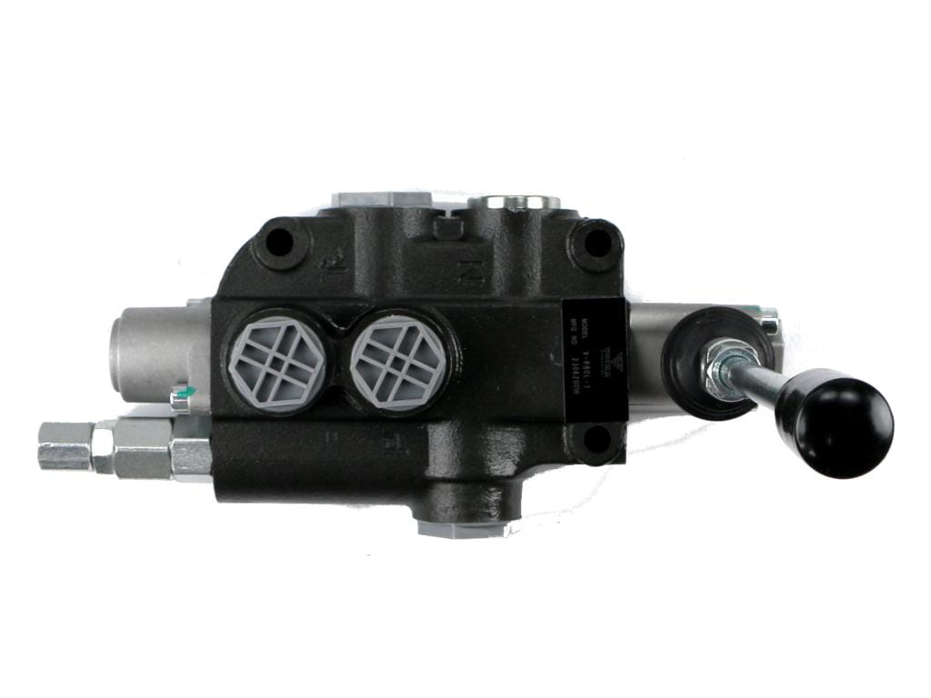 Rozdzielacz hydrauliczny 1-sekcyjny 80L VOIMA - monoblokowy z układem równoległym z neutralną pozycją środkową. Olej w pozycji neutralnej krąży między pompą hydrauliczną a zbiornikiem.
