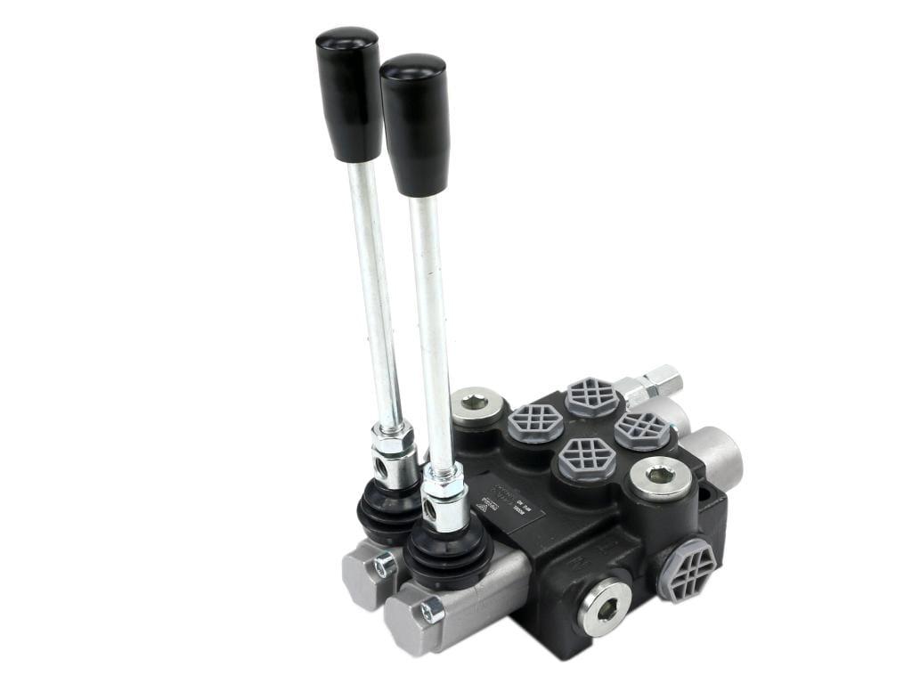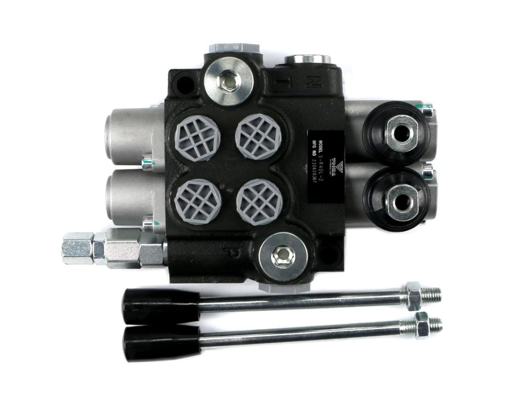 Rozdzielacz hydrauliczny 2-sekcyjny 40L VOIMA - monoblokowy z układem równoległym z neutralną pozycją środkową. Olej w pozycji neutralnej krąży między pompą hydrauliczną a zbiornikiem.