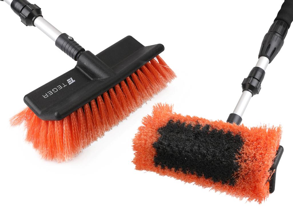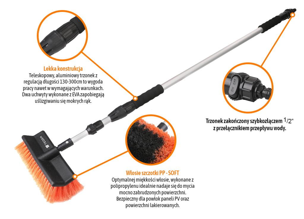 Szczotka teleskopowa - przepływowa (dł. 130-300cm) włosie PP TEGER to idealne narzędzie do mycia i odśnieżania paneli fotowoltaicznych, solarnych systemów podgrzewania wody, ciągników i maszyn rolniczych, ciężarówek, naczep, cystern oraz kamperów i przyczep kampingowych. Optymalnie miękkie włosie wykonane z polipropylenu jest bezpieczne dla powłok paneli i powierzchni lakierowanych. Solidny i lekki trzonek wykonany z aluminium, wyposażony w piankowe uchwyty (EVA) gwarantuje wygodę pracy nawet przy dużych powierzchniach. Trzonek zakończony jest przyłączem wody, podczas mycia zaleca się używanie węży 1/2 cala.