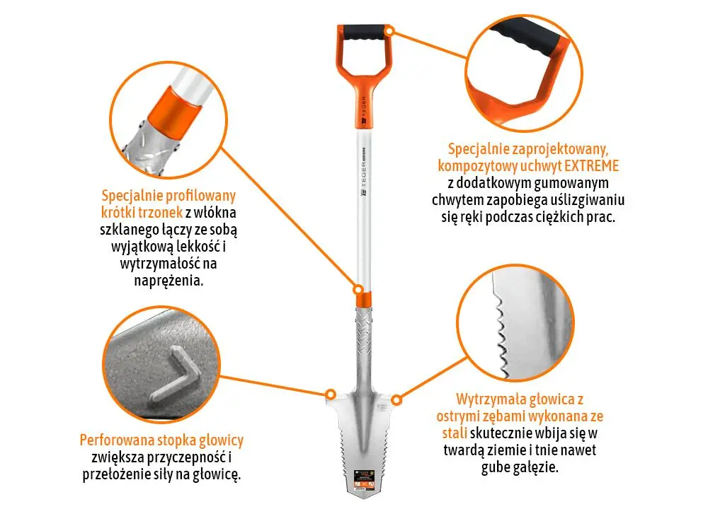 Szpadel zębaty na trzonku z włókna szklanego, (dł. 1150 mm) Extreme TEGER bardzo trwały i wytrzymały, głowica wykonana ze stali hartowanej, węglowej 50Mn, o podwyższonej wytrzymałości na ścieranie. Odpowiednio dobrana długość, specjalnie profilowana węższa i wyższa głowica z głęboko ząbkowanymi ostrzami po bokach znacząco ułatwiają pracę w najtrudniejszych warunkach. Specjalnie zaprojektowany lekki trzonek z włókna szklanego oraz ergonomiczny uchwyt Extreme polepsza komfort prac. Przeznaczony do pracy w wymagającej, bardzo twardej glebie, podczas sadzenia drzew i krzewów oraz montażu słupków, podpór ogrodzeniowych oraz przy usuwanie najbardziej uporczywych korzeni. Szpadel pokryty jest powłoką odporna na zarysowania ułatwiającą pracę z materiałami sypkimi i o podwyższonej lepkości.