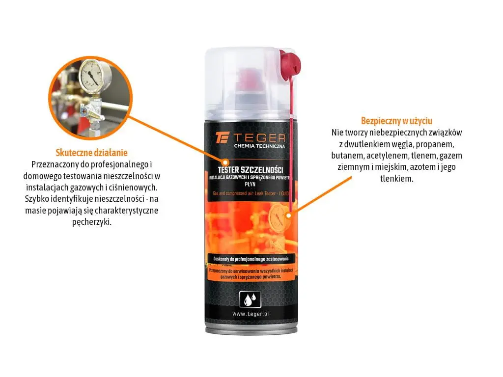 Tester szczelności instalacji gazowych i sprężonego powietrza TEGER to profesjonalny środek serwisowy do precyzyjnej lokalizacji nieszczelności w instalacjach gazowych (LPG, CNG, Propan, Butan itp.) i układów sprężonego powietrza pracujących pod ciśnieniem. Preparat zawiera specjalną substancję pokrywającą jednolitą masą elementy instalacji. W przypadku zaistnienia nieszczelności, na masie pojawiają się charakterystyczne pęcherzyki. Bezpieczny dla większości materiałów, w tym metali, tworzyw sztucznych i gumy. Nie tworzy niebezpiecznych związków z dwutlenkiem węgla, propanem, butanem, acetylenem, tlenem, gazem ziemnym i miejskim, azotem i jego tlenkiem. Nie powoduje korozji i jest łatwy w użyciu – wystarczy nanieść płyn na badane połączenia i obserwować reakcję.