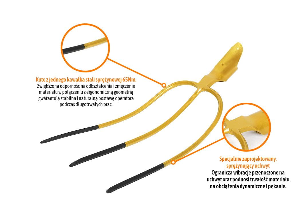 Widły gospodarcze 3-zębne nieoprawne kute TEGER to bardzo trwałe i wytrzymałe, zęby kute, wykonane z wysokiej jakości stali hartowanej, węglowej 65Mn, o podwyższonej wytrzymałości na pękanie.