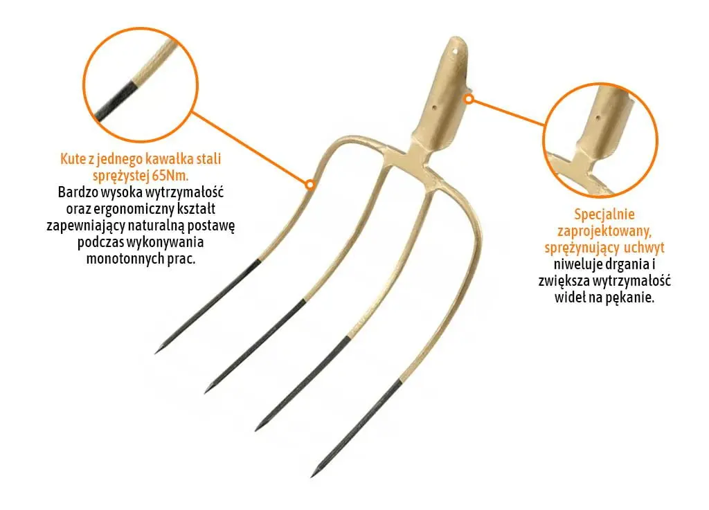 Widły gospodarcze 4-zębne, nieoprawne, kute, Tege bardzo trwałe i wytrzymałe, zęby kute, wykonane z wysokiej jakości stali hartowanej, węglowej 65Mn, o podwyższonej wytrzymałości na pękanie. Widły występują z uchwytem - bez trzonka, przeznaczone do zamontowania na trzonek drewniany o średnicy 38mm.