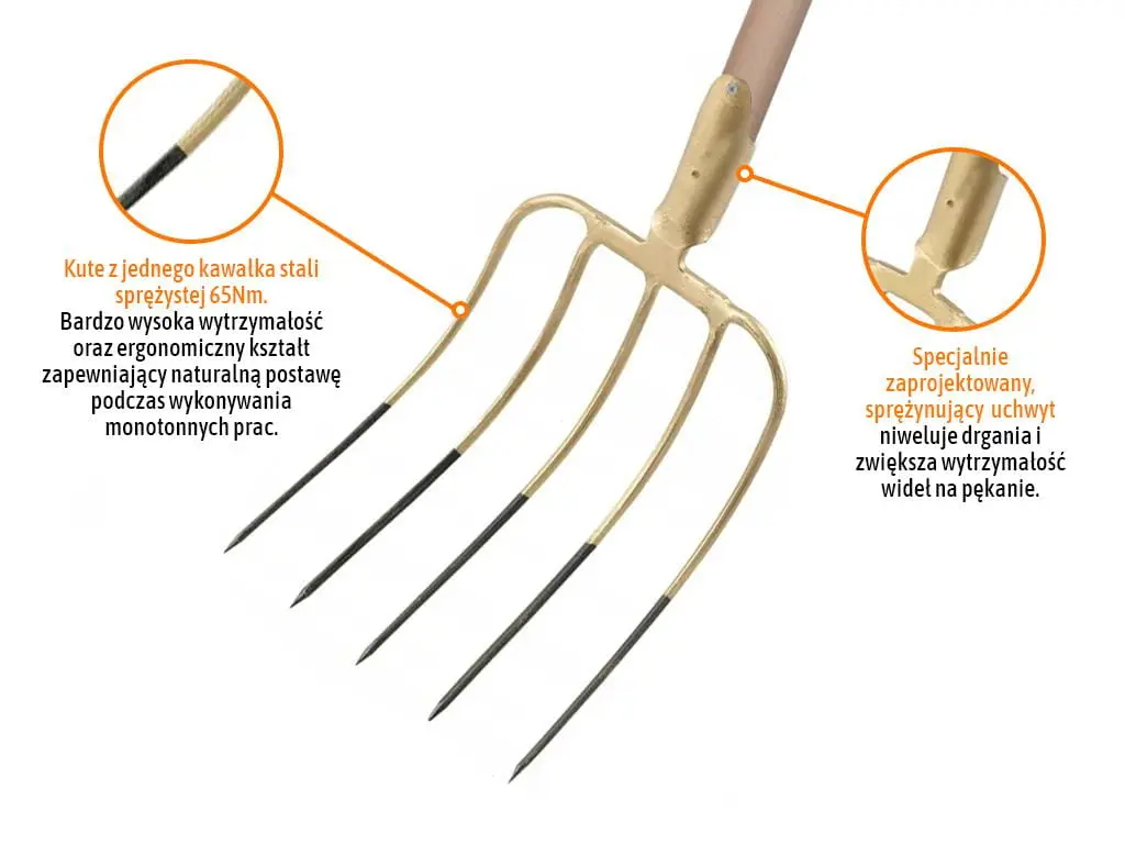 Widły gospodarcze 5-zębne na drewnianym trzonku (dł. 1500 mm), kute / TEGER bardzo trwałe i wytrzymałe, zęby kute, wykonane z wysokiej jakości stali hartowanej, węglowej 65Mn, o podwyższonej wytrzymałości na pękanie. Trzonek wykonany z wysokiej jakości drewna bukowego odpornego na złamania.