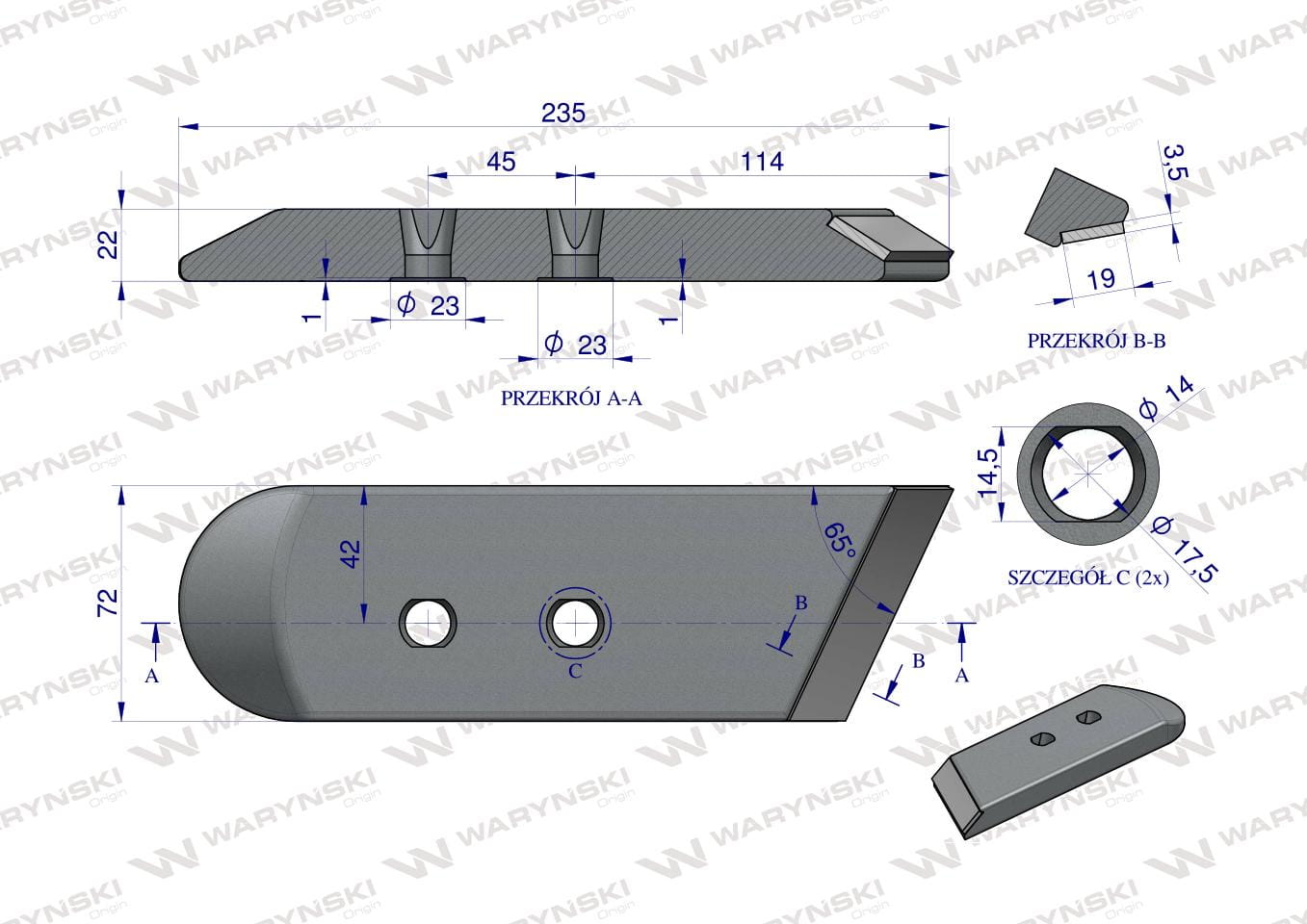 Dłuto. nakładka lemiesza prawe zastosowanie VIS/17 XL Unia Pług z węglikiem wolframu WARYŃSKI MAXX
