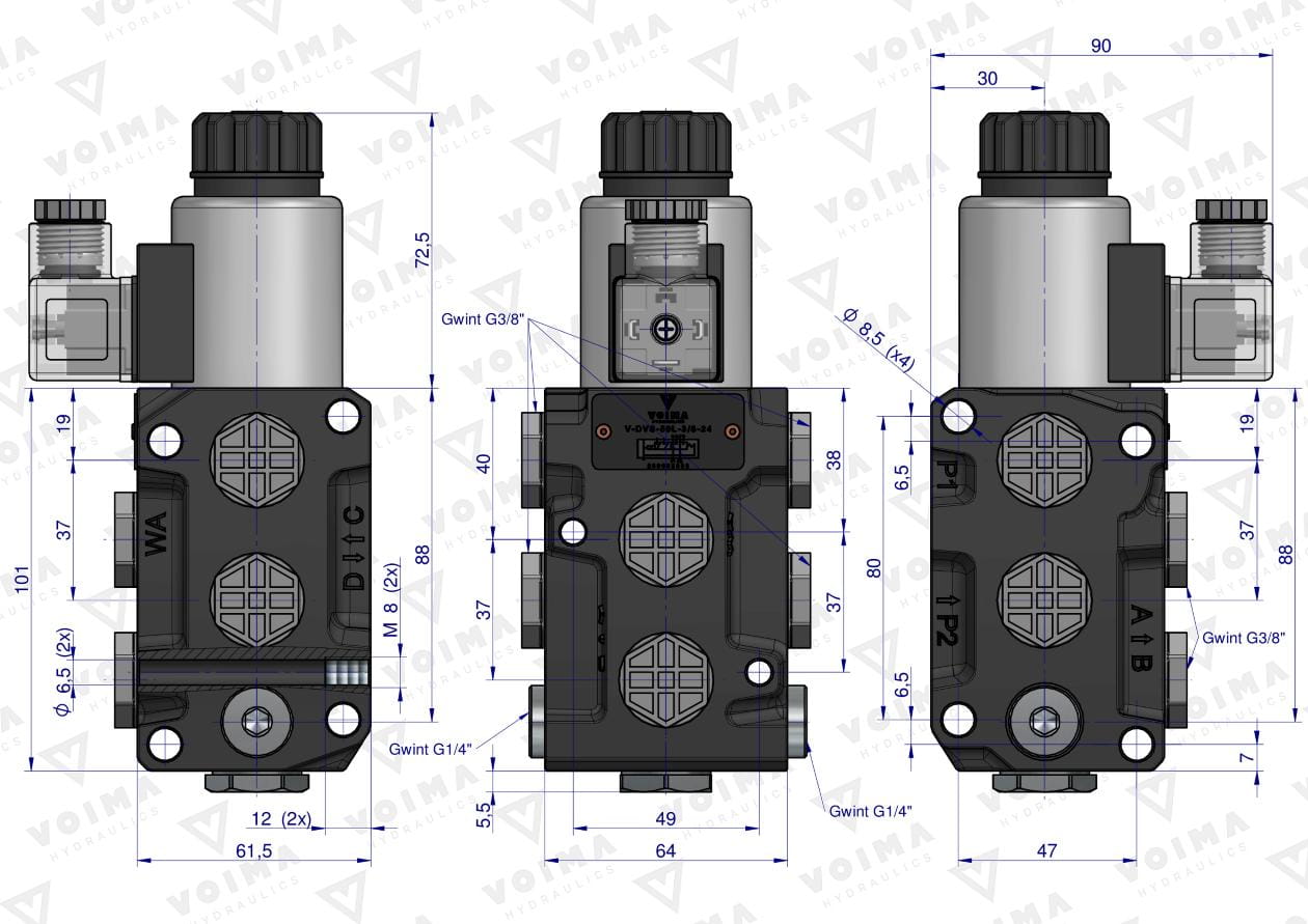 Dzielnik zawór elektrozawór kierunkowy elektromagnetyczny kontroli (DVS6/50 L/MIN) (24V DC) 6/2 G3/8 50L VOIMA