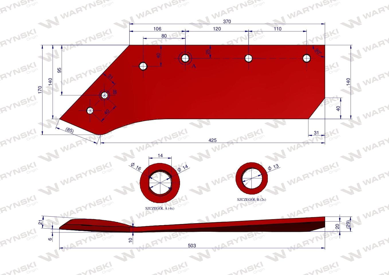 Części robocze marki WARYŃSKI wykonane są z niezwykle wytrzymałej i odpornej na ścieranie stali borowej pochodzącej z europejskich hut. Każda, nawet najmniejsza dostawa, posiada dołączony certyfikat potwierdzający skład materiałowy. Stal borowa posiada właściwości szczególnie przydatne w zastosowaniach konstrukcyjnych wymagających dużej wytrzymałości. Połączenie wysokogatunkowej stali borowej, monitorowanego procesu obróbki cieplnej oraz skrupulatna kontrola jakości produktów WARYŃSKI to gwarancja wydłużonego okresu eksploatacji. Produkty WARYŃSKI to oszczędność kosztów związanych z powolnym ścieraniem i zużyciem części roboczych. W trosce o trwałość naszych produktów oraz zadowolenie klientów proces produkcji lemieszy WARYŃSKI nie zakłada operacji spawania. Wszystkie rodzaje otworów są wykonane w specjalny sposób minimalizujący naprężenia oraz zmniejszający ryzyko pęknięć.