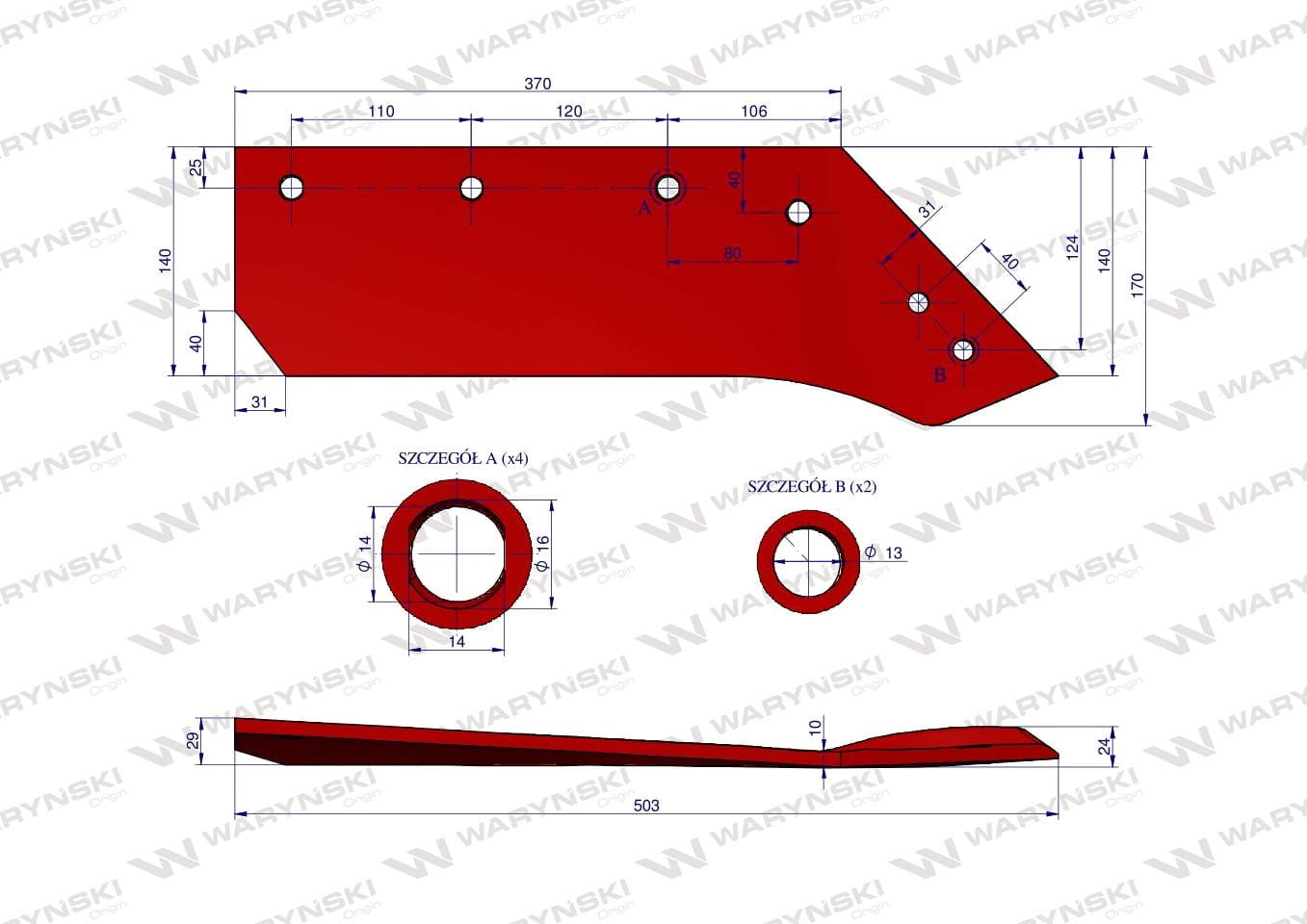 Części robocze marki WARYŃSKI wykonane są z niezwykle wytrzymałej i odpornej na ścieranie stali borowej pochodzącej z europejskich hut. Każda, nawet najmniejsza dostawa, posiada dołączony certyfikat potwierdzający skład materiałowy. Stal borowa posiada właściwości szczególnie przydatne w zastosowaniach konstrukcyjnych wymagających dużej wytrzymałości. Połączenie wysokogatunkowej stali borowej, monitorowanego procesu obróbki cieplnej oraz skrupulatna kontrola jakości produktów WARYŃSKI to gwarancja wydłużonego okresu eksploatacji. Produkty WARYŃSKI to oszczędność kosztów związanych z powolnym ścieraniem i zużyciem części roboczych. W trosce o trwałość naszych produktów oraz zadowolenie klientów proces produkcji lemieszy WARYŃSKI nie zakłada operacji spawania. Wszystkie rodzaje otworów są wykonane w specjalny sposób minimalizujący naprężenia oraz zmniejszający ryzyko pęknięć.