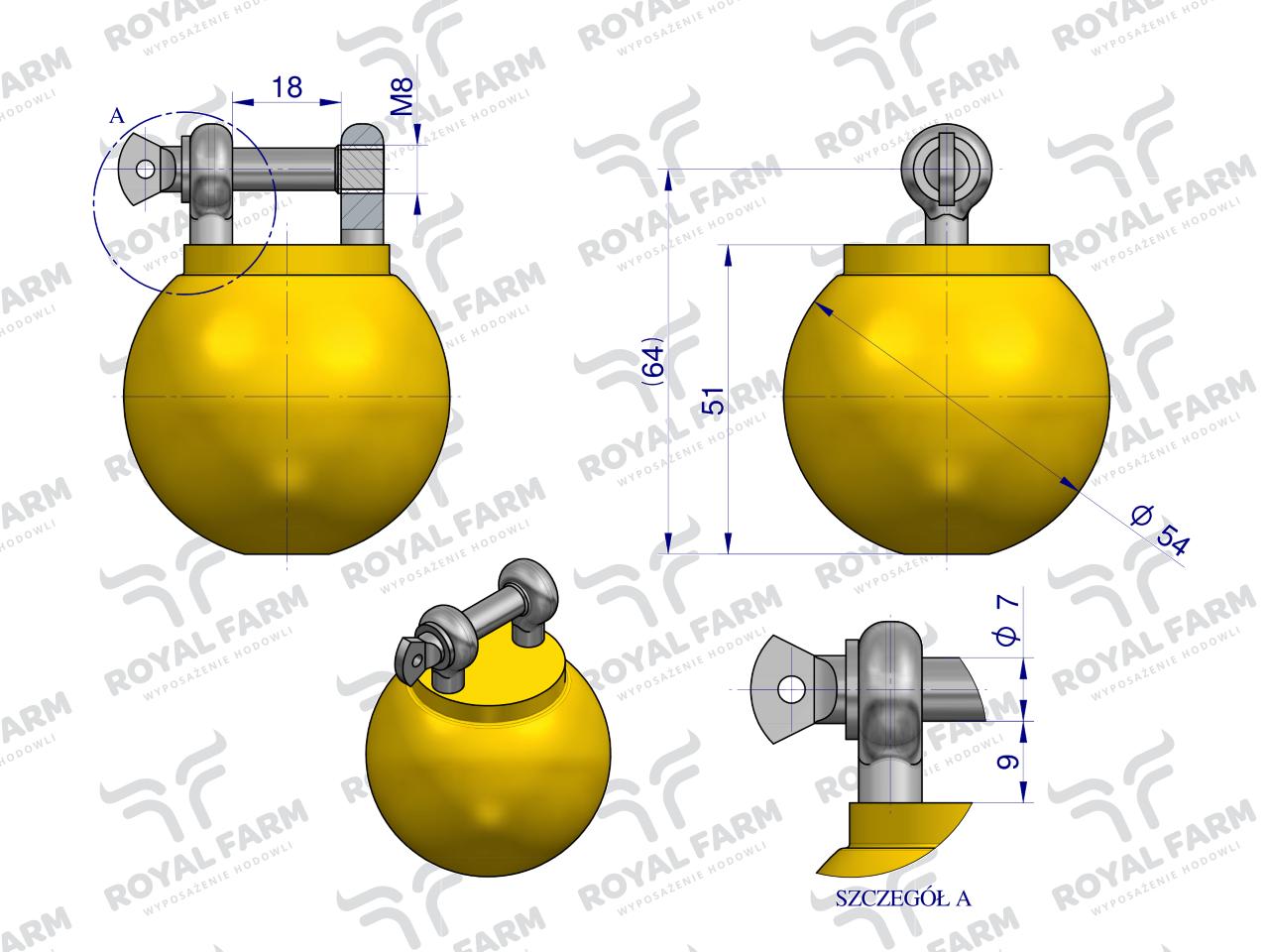 Piłka antystresowa do gryzienia o średnicy 55 mm dla tuczników Zapewnia dystrakcję, dzięki czemu zapobiega agresywnym zachowaniom oraz podgryzaniu ogonów Długotrwałe użytkowanie, zapewnione jest dzięki wysokiej jakości wykonania Gryzak, piłka wykonany jest z poliuretanu, natomiast części metalowe wykonane są ze stali ocynkowane.