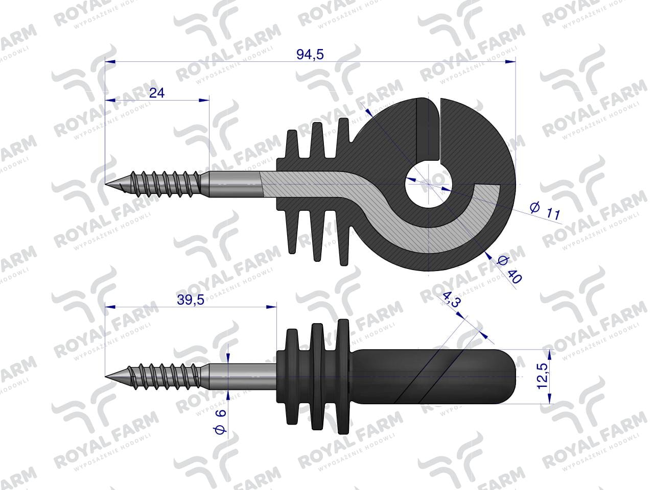 Izolator okrągły z wkrętem fi 6 do drewna z zatopionym trzpieniem wygiętym ROYAL FARM