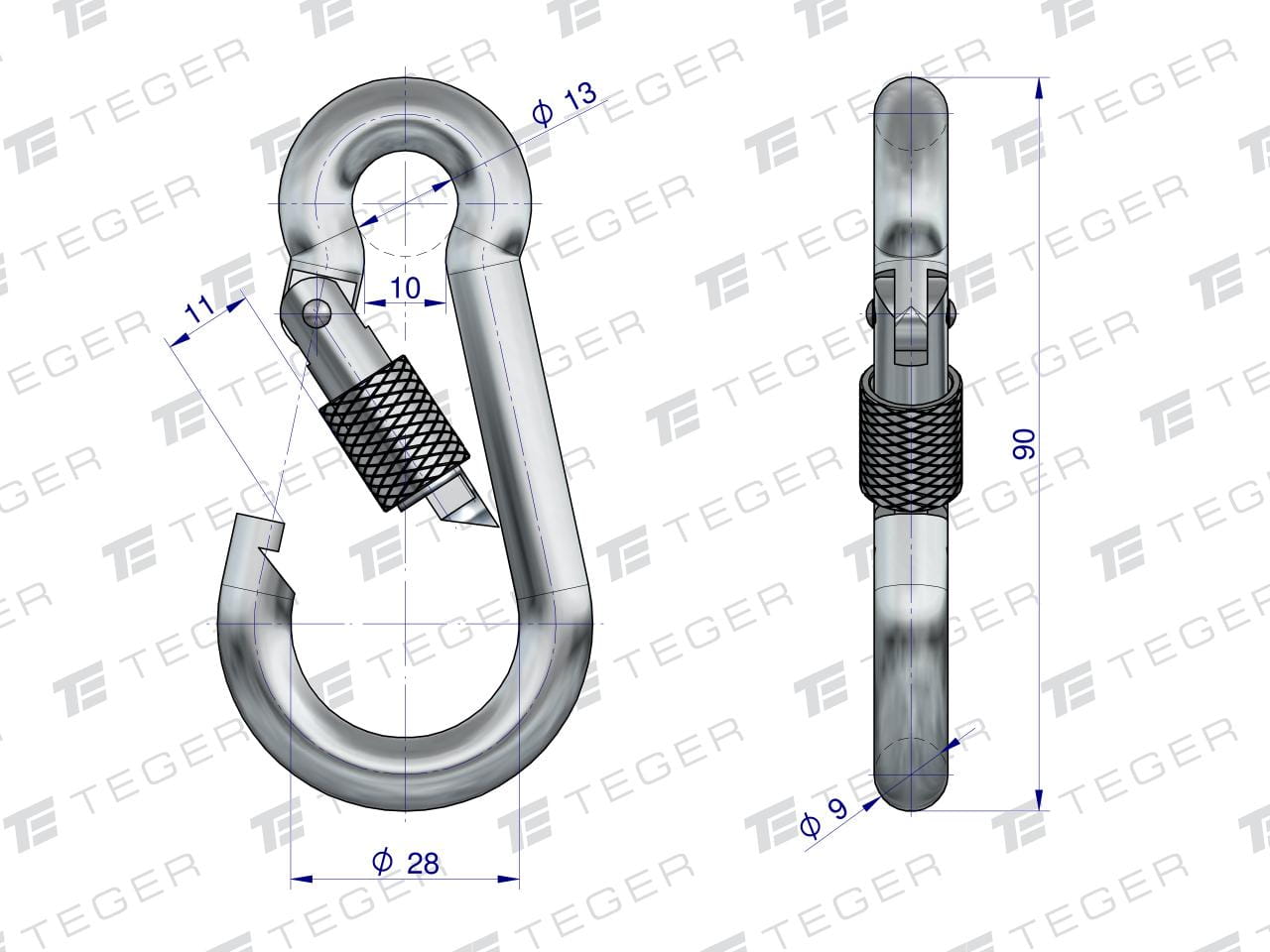 Karabińczyk z zabezpieczeniem 9x90 TEGER, (sprzedawane po 25)