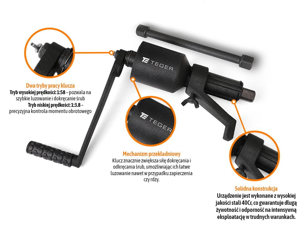 Zastosowanie: Narzędzia TEGER nadają się dla każdego majsterkowicza jak i profesjonalisty. Znajdą zastosowanie w przydomowym garażu czy gospodarstwie rolnym. Klucz idealnie nadaje się do zastosowań profesjonalnych wymagających dużego momentu obrotowego i odporności na duże obciążenia w mechanice przy pracach serwisowych w warsztatach samochodowych. Przeznaczony głównie do odkręcania i dokręcania kół w pojazdach ciężarowych maszynach rolniczych i budowlanych. Idealny do serwisów oponiarskich obsługujących auta dostawcze i ciężarowe. Niezastąpiony w warsztatach mechanicznych i mobilnych punktach serwisowych i oponiarskich. Sprawdza się w warunkach intensywnej eksploatacji wszędzie tam gdzie nie ma dostępu do kluczy pneumatycznych a wymagana jest siła i precyzja.