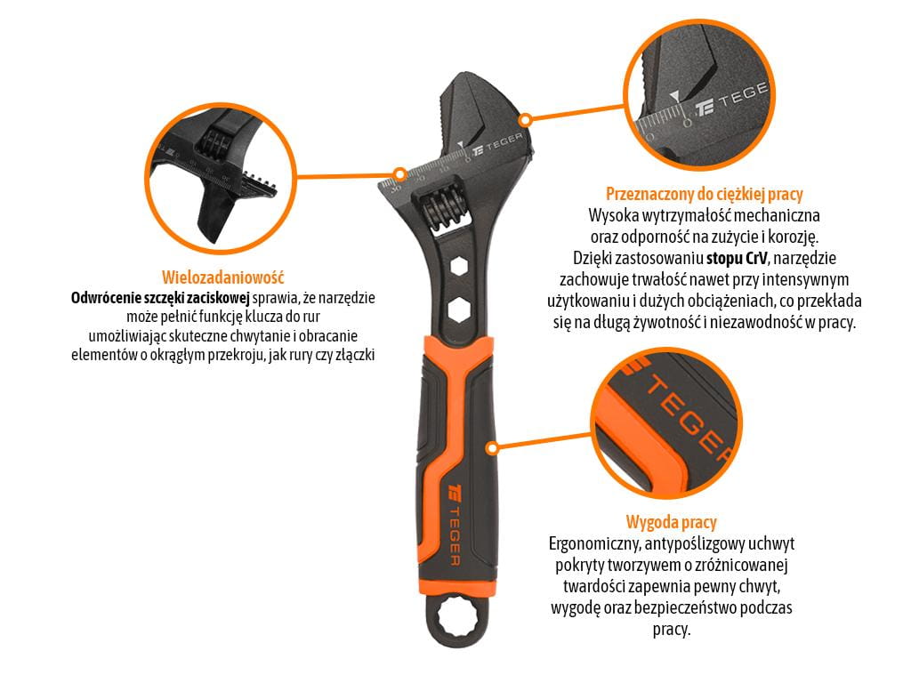 Narzędzia TEGER nadają się dla każdego majsterkowicza jak i profesjonalisty. Znajdą zastosowanie w przydomowym garażu gospodarstwie rolnym oraz na budowie. Klucz nastawny 2-funkcyjny to idealny wybór do zastosowań profesjonalnych zarówno w warsztatach mechanicznych jak i podczas prac domowych. Dzięki wysokiej jakości wykonania klucz zapewnia niezawodność i wygodę użytkowania w każdych warunkach.
