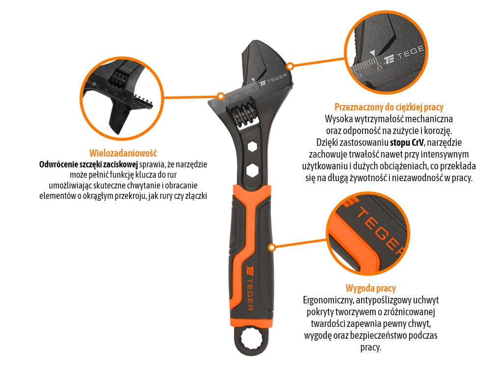 Narzędzia TEGER nadają się dla każdego majsterkowicza jak i profesjonalisty. Znajdą zastosowanie w przydomowym garażu gospodarstwie rolnym oraz na budowie. Klucz nastawny 2-funkcyjny to idealny wybór do zastosowań profesjonalnych zarówno w warsztatach mechanicznych jak i podczas prac domowych. Dzięki wysokiej jakości wykonania klucz zapewnia niezawodność i wygodę użytkowania w każdych warunkach.