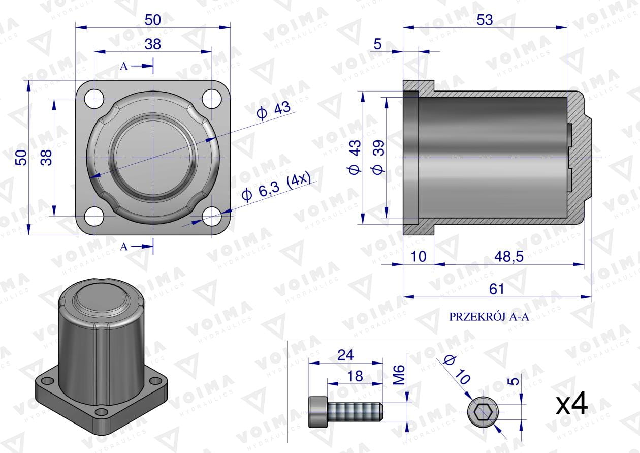 Zastosowanie: Kołpak dolny pasujący do rozdzielaczy hydraulicznych VOIMA o przepływie 120L/min. Wymieniany w przypadku mechanicznego uszkodzenia kołpaka zamontowanego w rozdzielaczu.