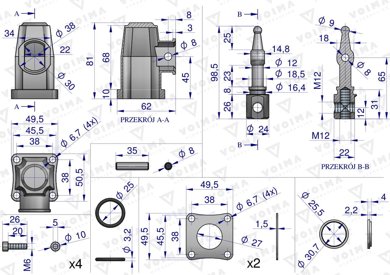 Zastosowanie: Kołpak górny (przedni pod dźwignię) pasujący do rozdzielaczy hydraulicznych VOIMA o przepływie 120L/min. Wymieniany w przypadku mechanicznego uszkodzenia kołpaka zamontowanego w rozdzielaczu.