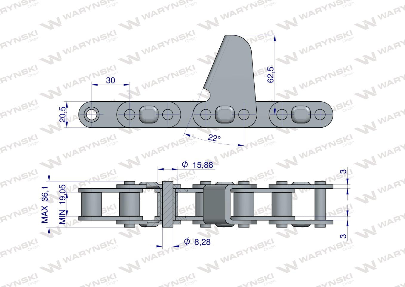 Wysokość zabieraka od osi łańcucha: 62,5 [mm]