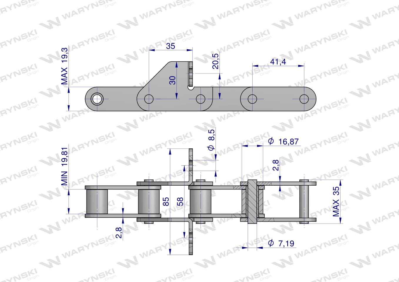 Wysokość zabieraka od osi łańcucha: 30,0 mm