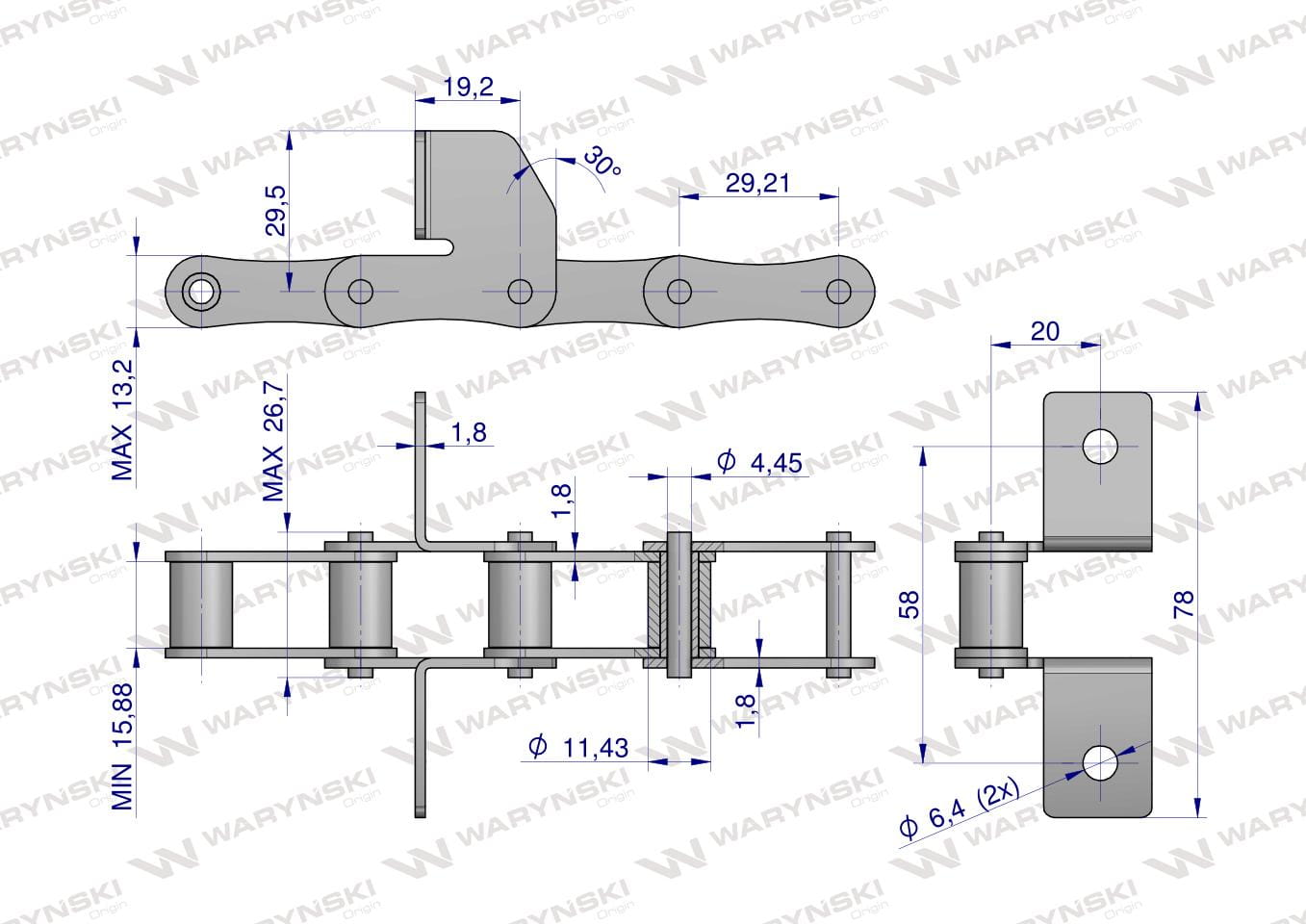 Wysokość zabieraka od osi łańcucha: 29,5 mm