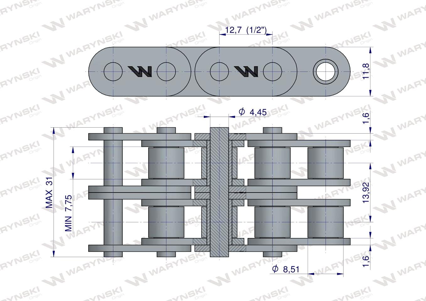 Łańcuch rolkowy prosta płytka 08B-2 (R2 1/2) 5 m Waryński