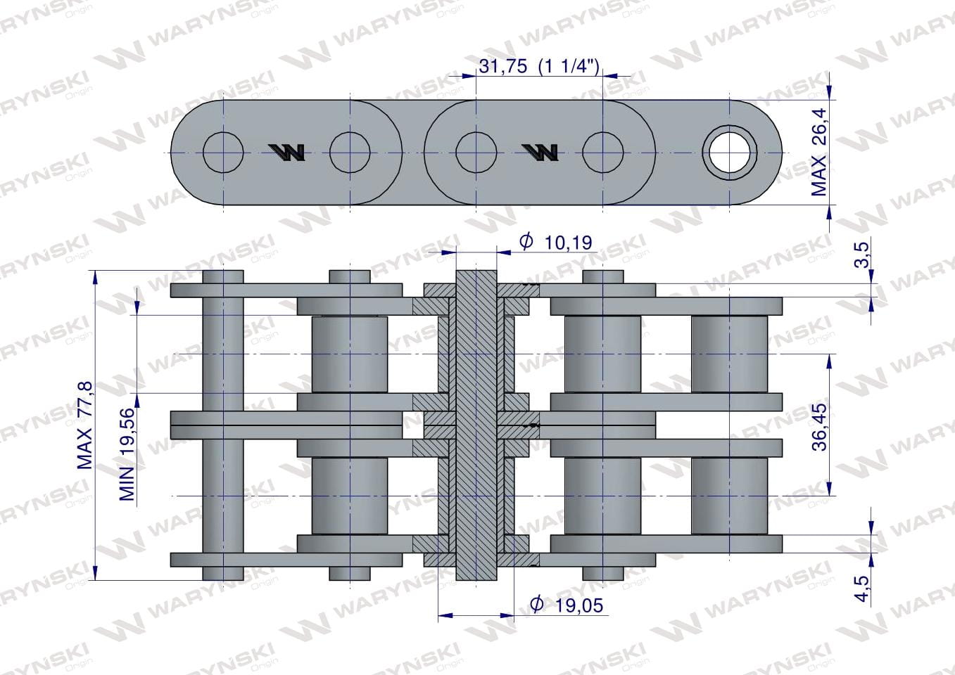 Łańcuch rolkowy prosta płytka 20B-2 (R2 1.1/4) 5 m Waryński