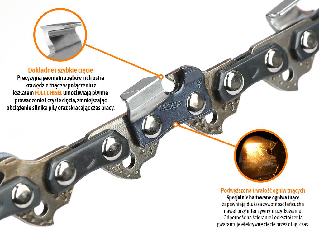 Dzięki zastosowaniu pełnego dłuta, łańcuch zapewnia agresywne i precyzyjne cięcie, co sprawia, że jest szczególnie polecany do cięcia twardego drewna oraz intensywnej eksploatacji. Wykonany ze stali manganowej 65Mn, która zapewnia podwyższoną wytrzymałość na zrywanie, przez co wydłuża żywotność łańcucha. Dzięki automatycznemu systemowi smarowania, olej rozprowadzany jest równomiernie po całej długość prowadnicy. Powoduje to zmniejszenie oporów tarcia, redukując nagrzewanie się prowadnicy i wydłużając żywotność całego układu tnącego.