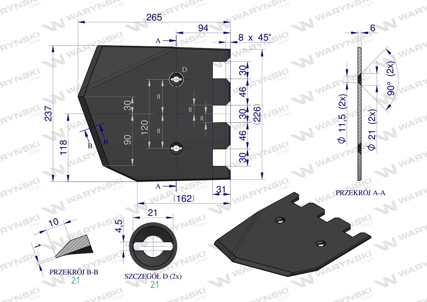 Części robocze marki WARYŃSKI wykonane są z niezwykle wytrzymałej i odpornej na ścieranie stali borowej pochodzącej z europejskich hut. Każda, nawet najmniejsza dostawa, posiada dołączony certyfikat potwierdzający skład materiałowy. Stal borowa posiada właściwości szczególnie przydatne w zastosowaniach konstrukcyjnych wymagających dużej wytrzymałości. Połączenie wysokogatunkowej stali borowej, monitorowanego procesu obróbki cieplnej oraz skrupulatna kontrola jakości produktów WARYŃSKI to gwarancja wydłużonego okresu eksploatacji. Produkty WARYŃSKI to oszczędność kosztów związanych z powolnym ścieraniem i zużyciem części roboczych. Wszystkie rodzaje otworów są wykonane w specjalny sposób minimalizujący naprężenia oraz zmniejszający ryzyko pęknięć.