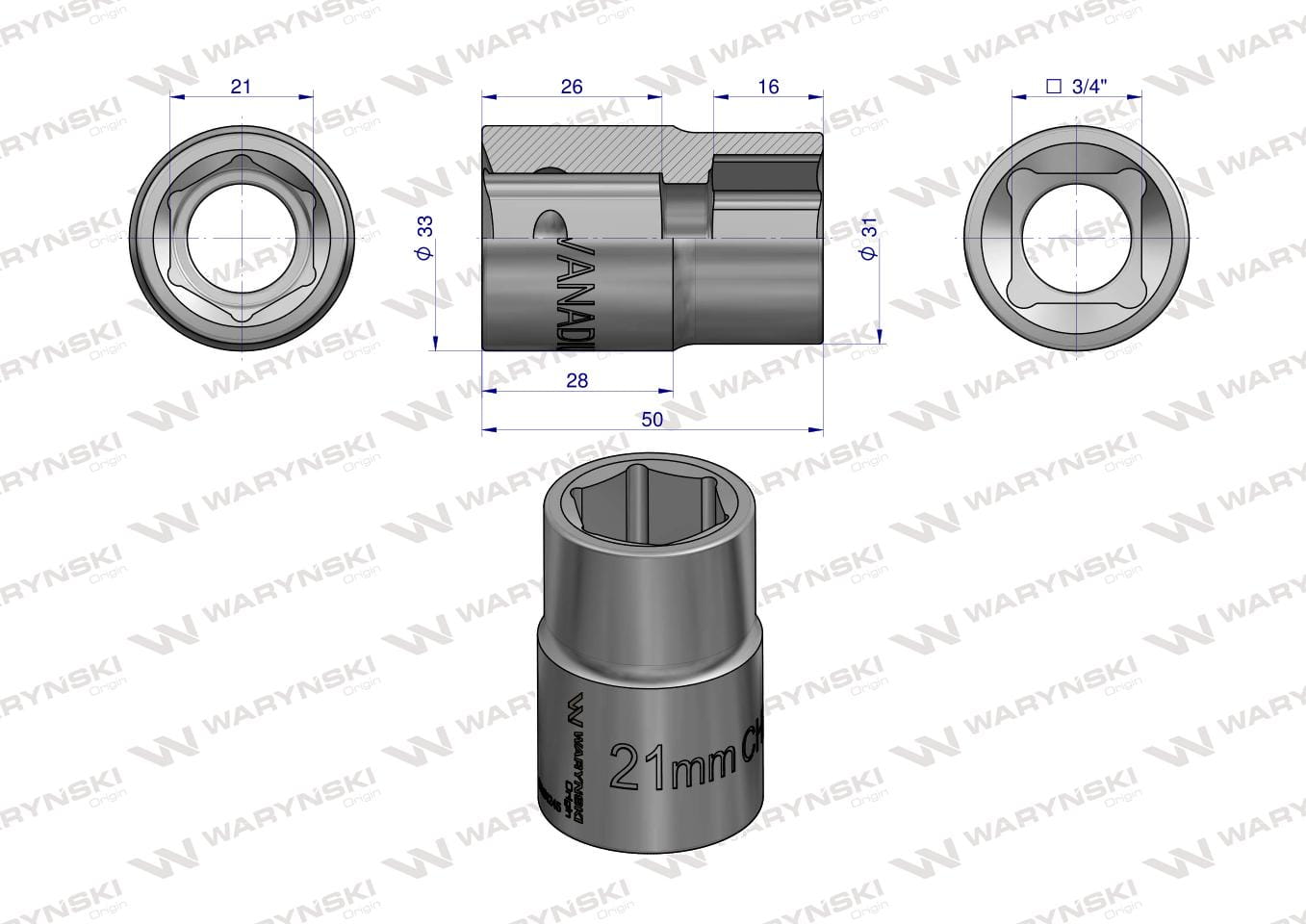 Nasadka sześciokątna 3/4" 21 mm CrV50BV30 DIN 3124 Waryński
