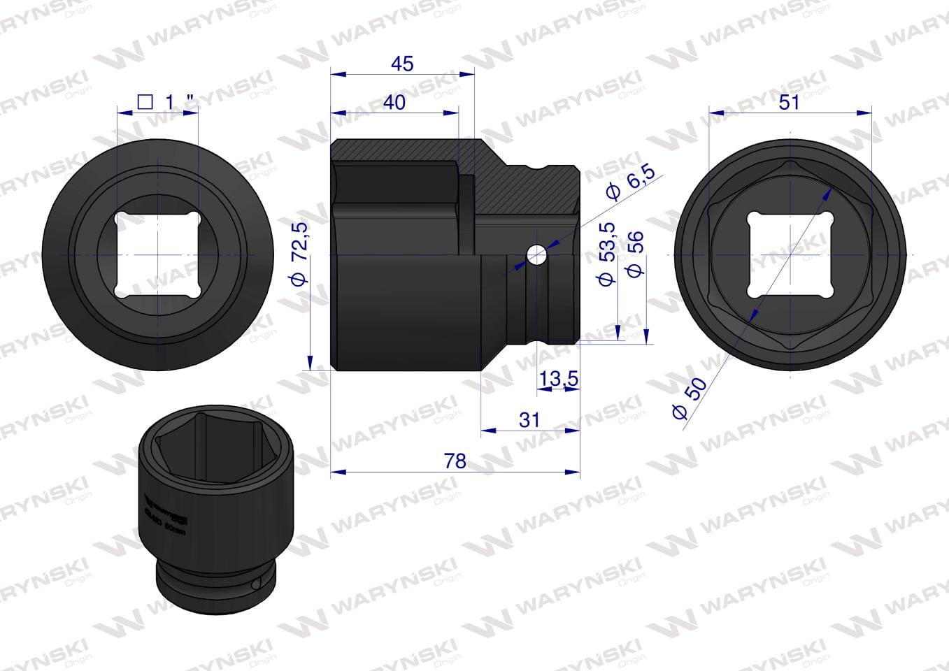 Nasadka udarowa 1" sześciokątna 50mm Waryński