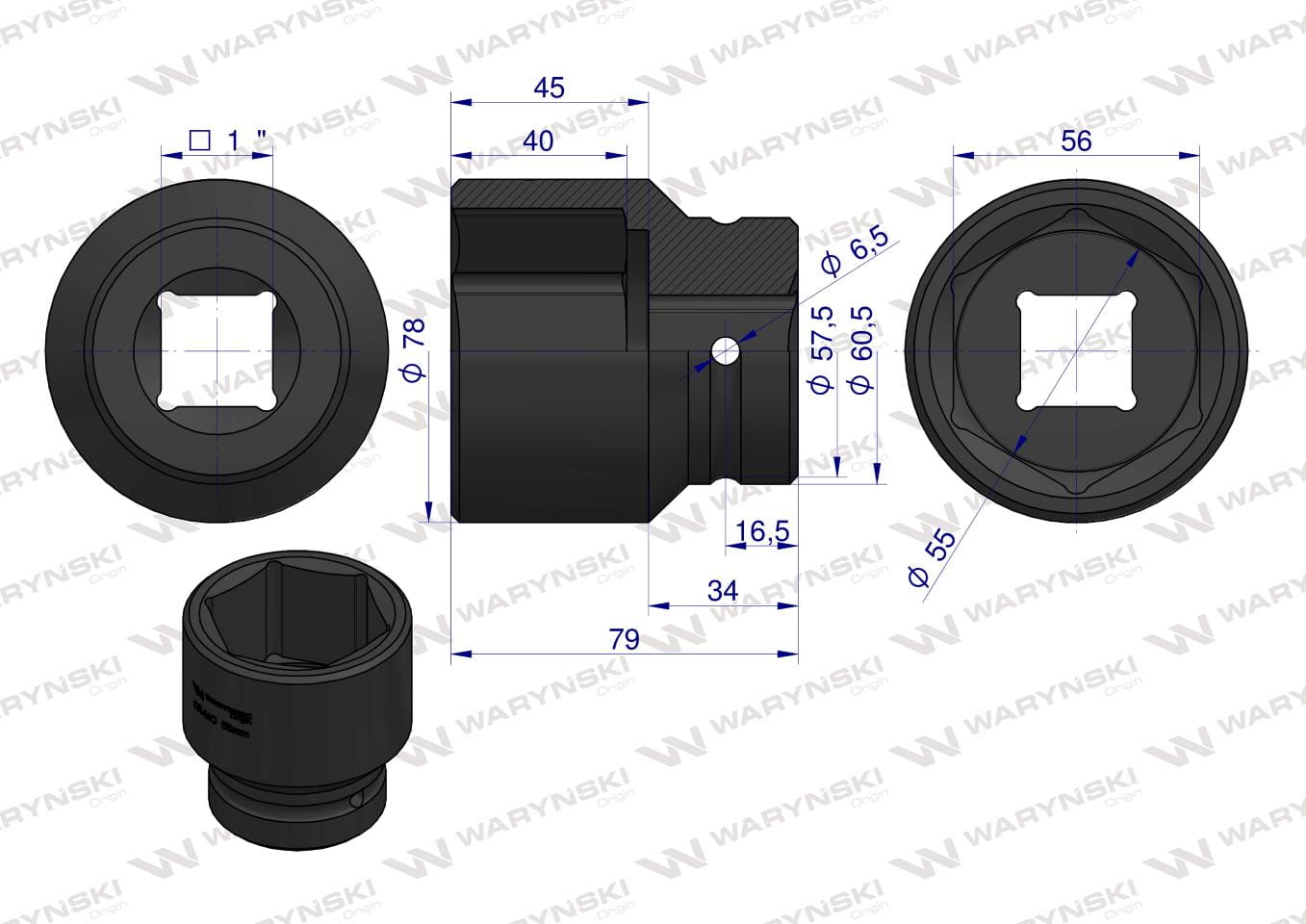 Nasadka udarowa 1 cal sześciokątna rozmiar 55mm z utwardzanej stali CrMo, przeznaczona do pracy z zastosowaniem uchwytu lub klucza udarowego Waryński