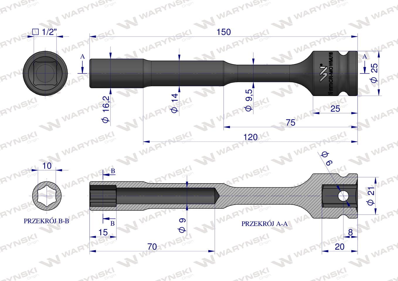 Nasadka udarowa 1/2", sześciokątna slim przelotowa ze stali CrMo 10mm długość 150 mm, stosowane w mechanice do kluczy udarowych, Waryński