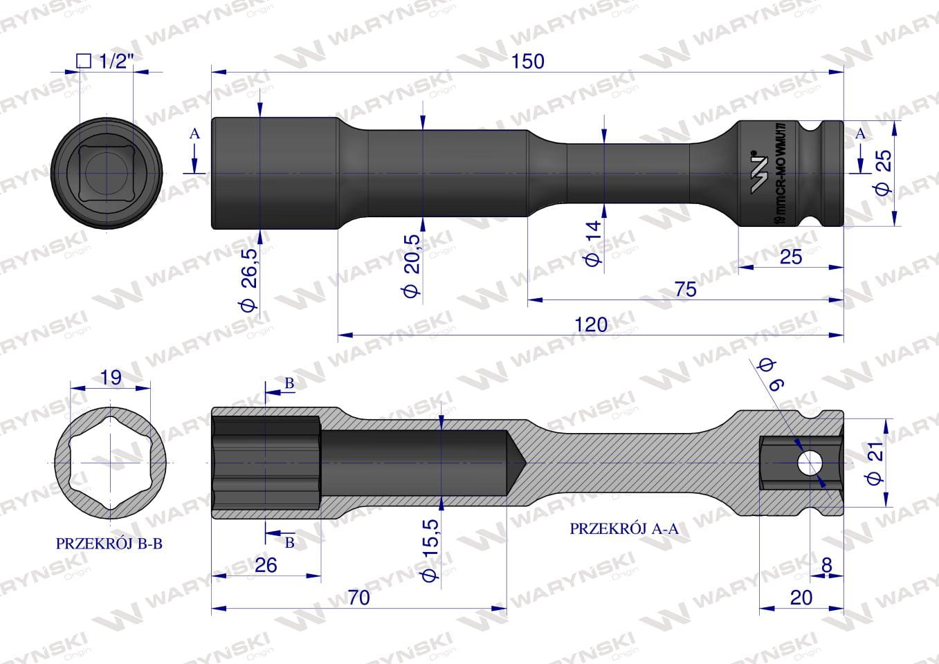 Nasadka udarowa 1/2", sześciokątna slim przelotowa ze stali CrMo 19mm długość 150 mm, stosowane w mechanice do kluczy udarowych, Waryński