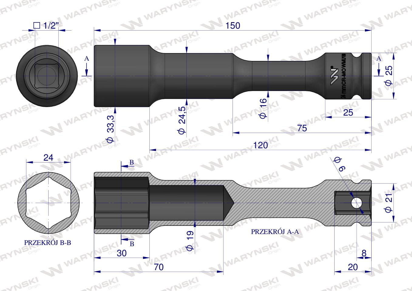 Nasadka udarowa 1/2", sześciokątna slim przelotowa ze stali CrMo 24mm długość 150 mm, stosowane w mechanice do kluczy udarowych, Waryński