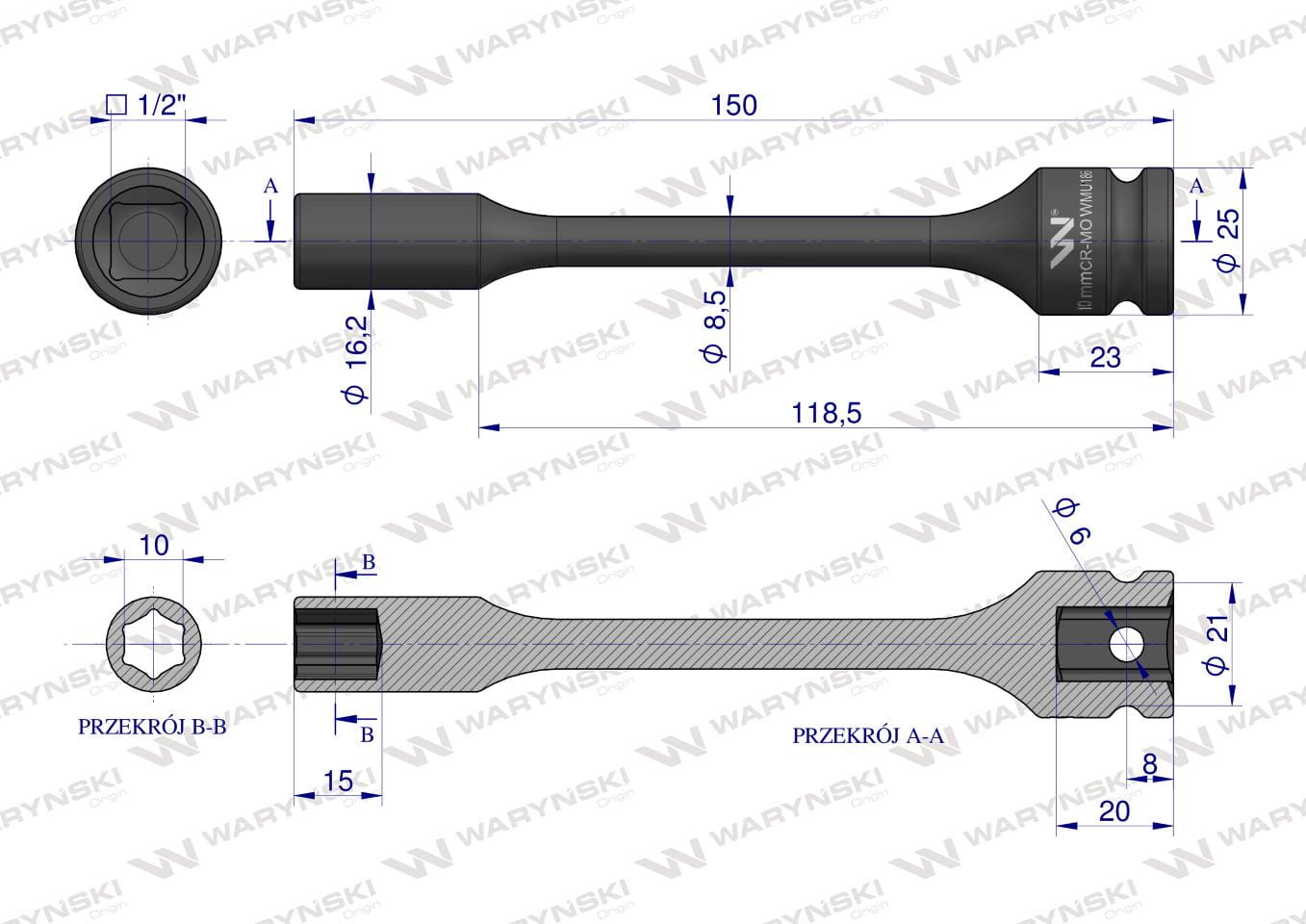 Nasadka udarowa 1/2", sześciokątna slim ze stali CrMo 10mm długość 150 mm, stosowane w mechanice do kluczy udarowych, Waryński