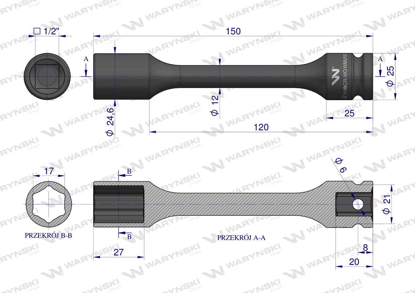 Nasadka udarowa 1/2", sześciokątna slim ze stali CrMo 17mm długość 150 mm, stosowane w mechanice do kluczy udarowych, Waryński