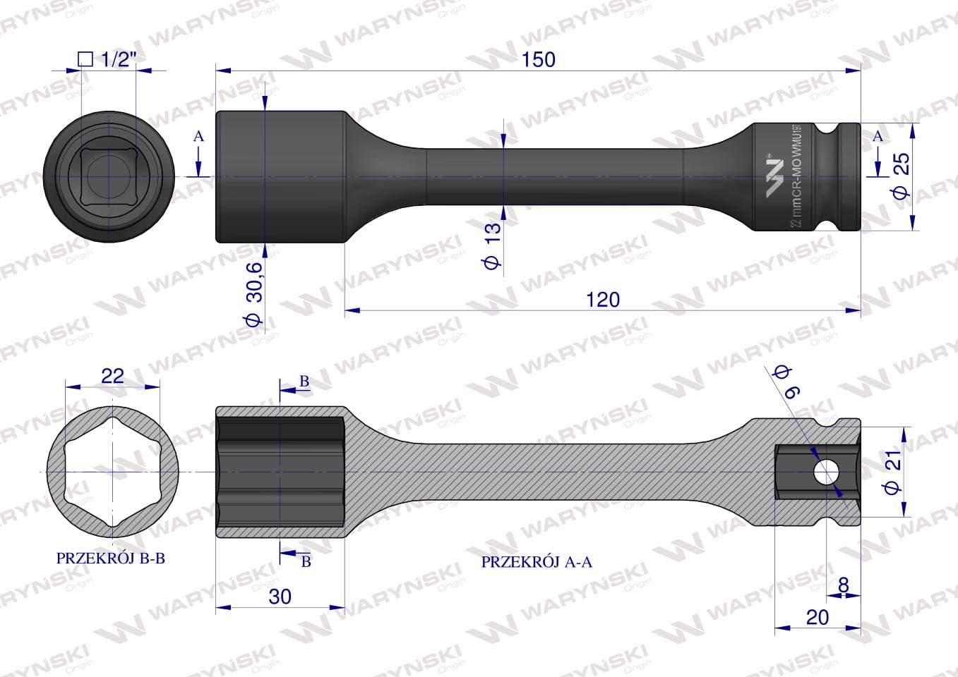 Nasadka udarowa 1/2", sześciokątna slim ze stali CrMo 22mm długość 150 mm, stosowane w mechanice do kluczy udarowych, Waryński