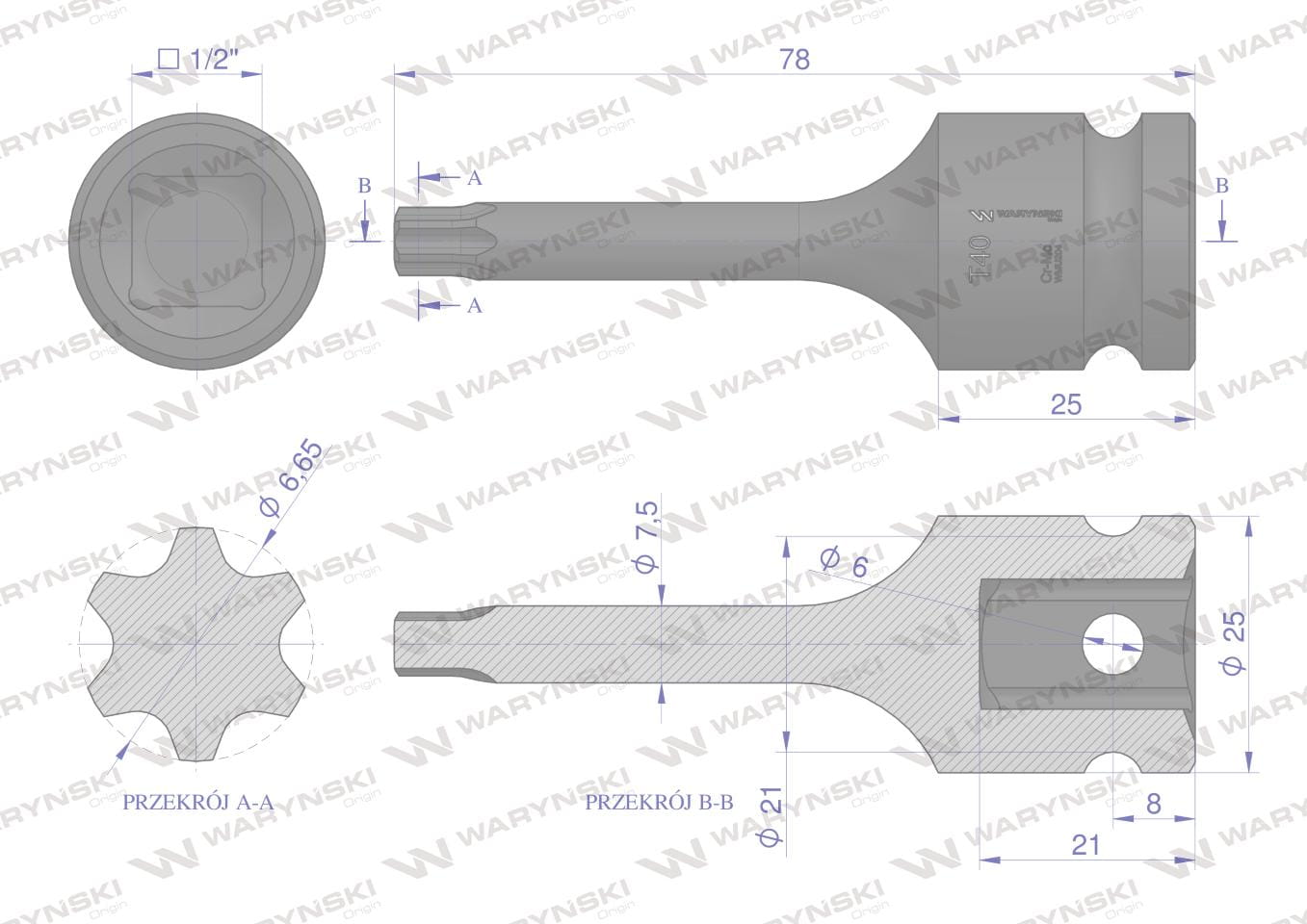 Nasadka udarowa 1/2 cala typu STAR TORX rozmiar T40 z utwardzanej stali CrMo, przeznaczona do pracy z zastosowaniem uchwytu lub klucza udarowego Waryński