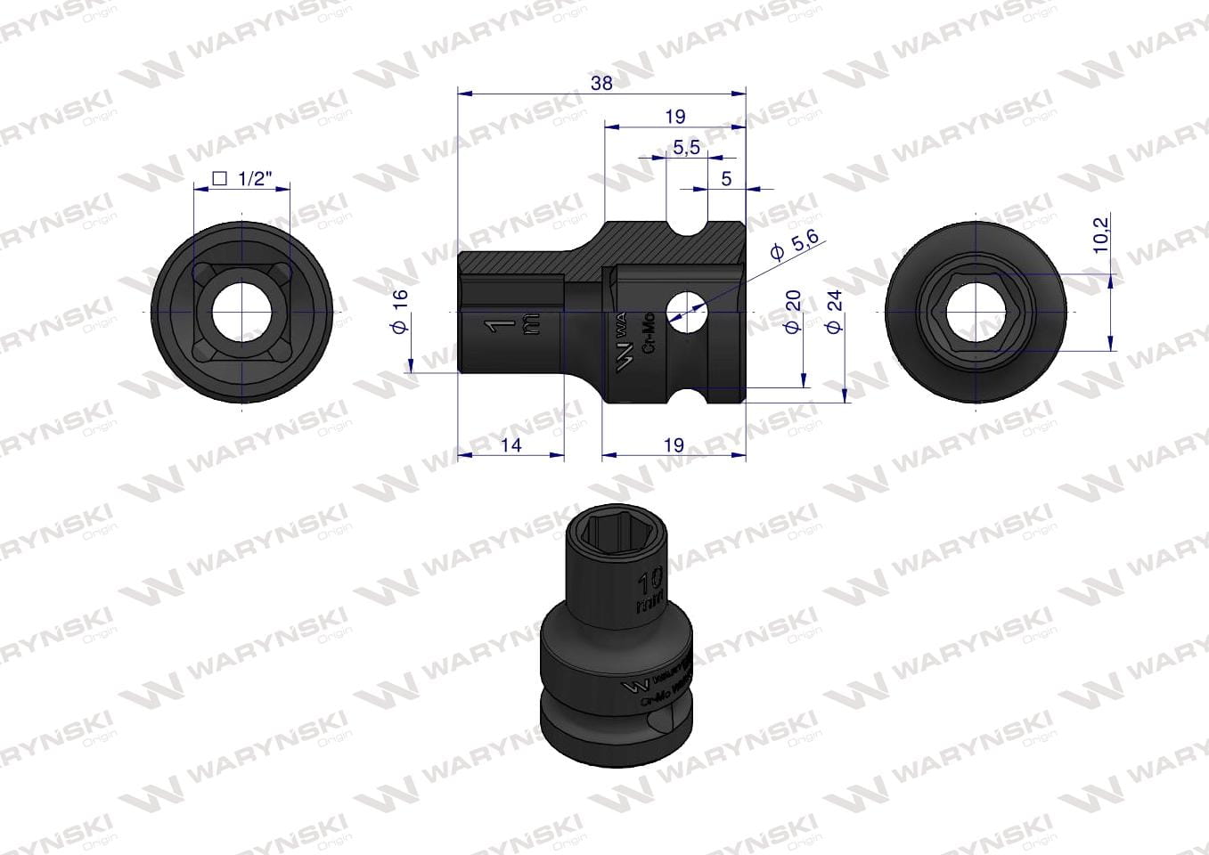 Nasadka udarowa sześciokątna 1/2". 10 mm. CrMo. DIN 3129. Waryński