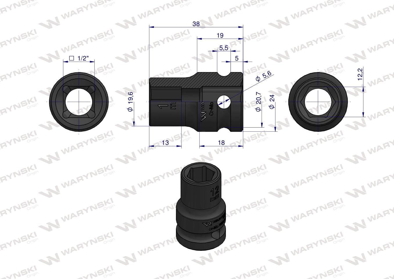 Nasadka udarowa sześciokątna 1/2". 12 mm. CrMo. DIN 3129. Waryński