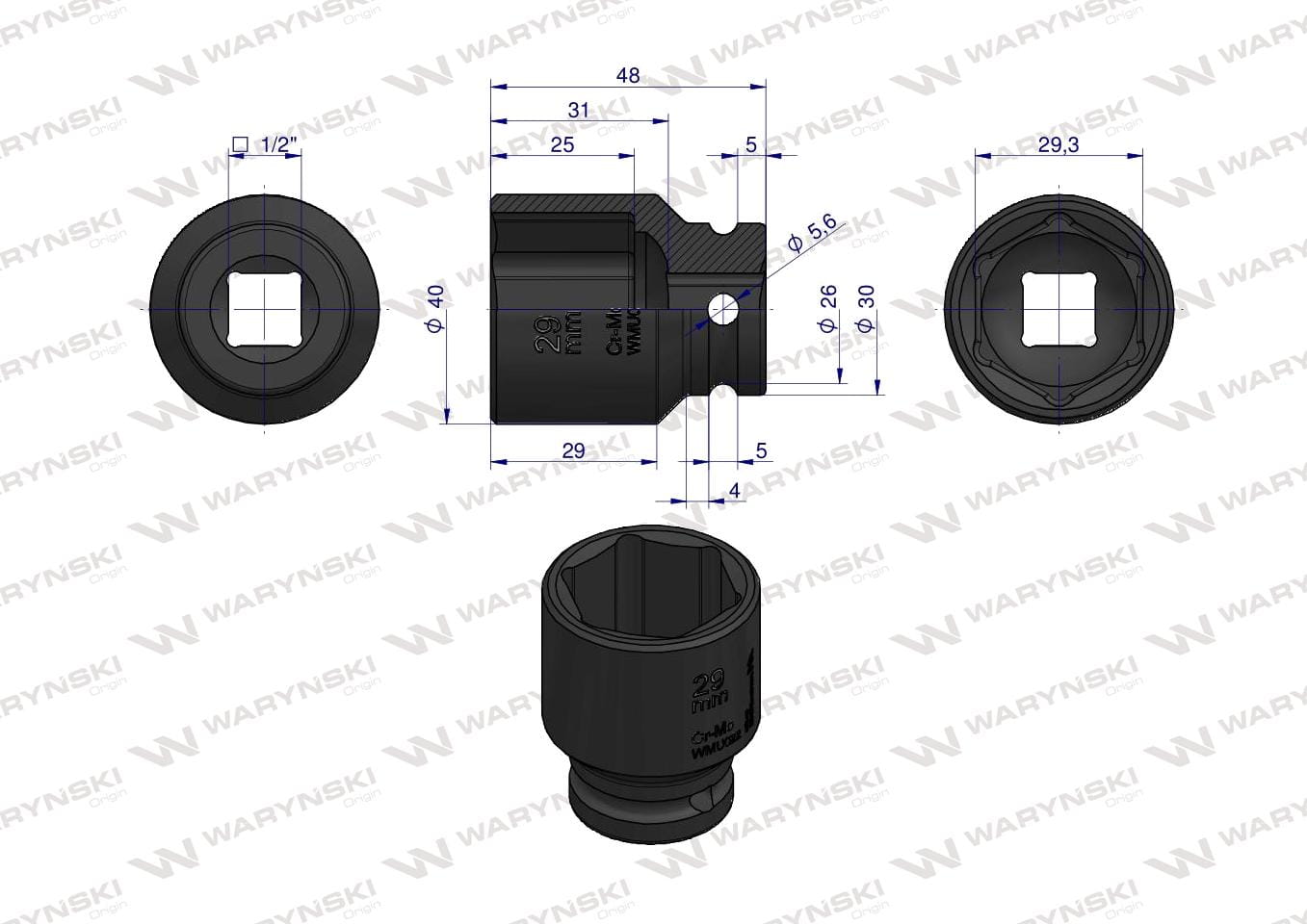 Nasadka udarowa sześciokątna 1/2". 29 mm. CrMo. DIN 3129. Waryński