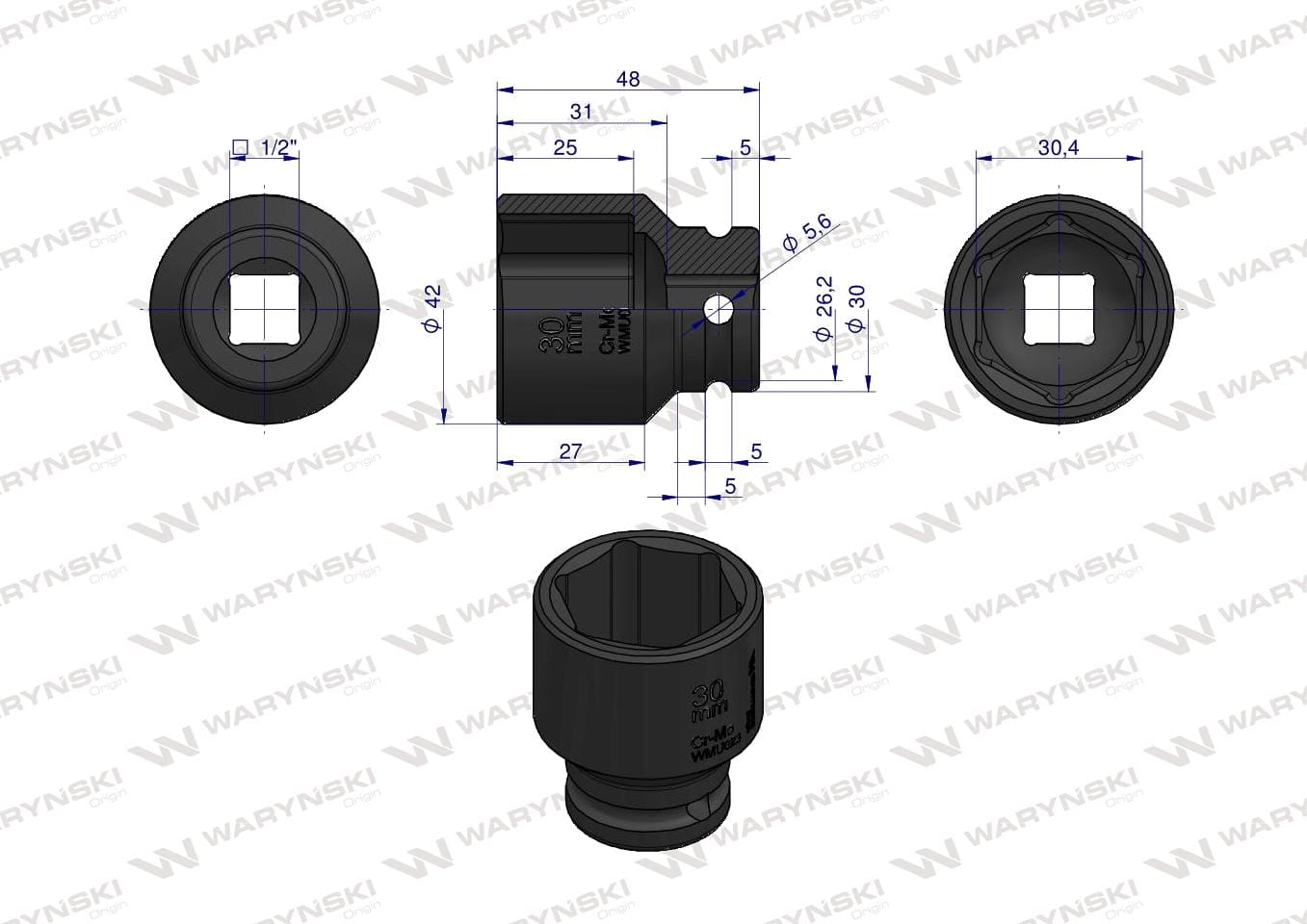 Nasadka udarowa sześciokątna 1/2". 30 mm. CrMo. DIN 3129. Waryński