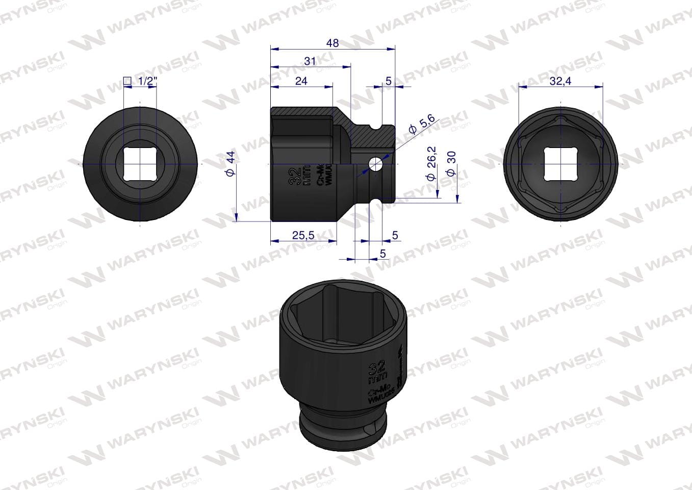 Nasadka udarowa sześciokątna 1/2". 32 mm. CrMo. DIN 3129. Waryński